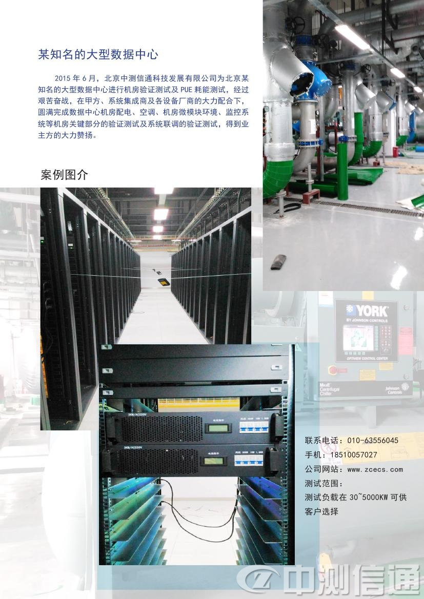 2014年12月,北京中測信通科技發(fā)展有限公司為北京某知名的大型數(shù)據(jù)中心進行機房驗證測試及PUE耗能測試,經(jīng)過艱苦奮戰(zhàn),在甲方、系統(tǒng)集成商及各設備廠商的大力配合下,圓滿完成數(shù)據(jù)中心機房配電、空調(diào)、機房微模塊環(huán)境、監(jiān)控系統(tǒng)等機房關(guān)鍵部分的驗證測試及系統(tǒng)聯(lián)調(diào)的驗證測試,得到業(yè)主方的大力贊揚。