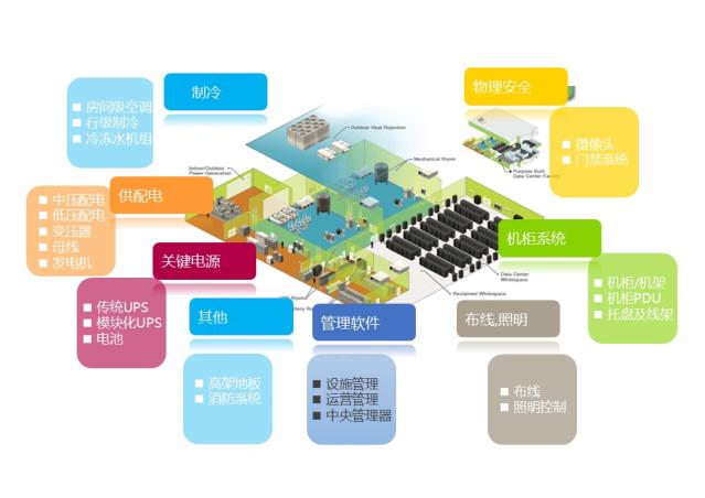 制冷----供配電---關(guān)鍵電源----機柜系統(tǒng)---布線照明---物理安全---管理軟件---其他