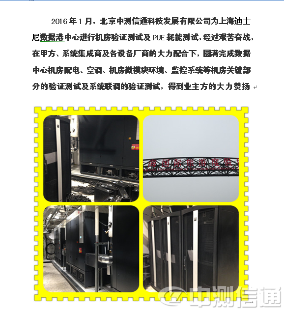 2015年8月,北京中測信通科技發(fā)展有限公司為上海迪斯尼數(shù)據(jù)中心進(jìn)行機(jī)房驗證測試及PUE耗能測試,經(jīng)過艱苦奮戰(zhàn),在甲方、系統(tǒng)集成商及各設(shè)備廠商的大力配合下,圓滿完成數(shù)據(jù)中心機(jī)房配電、空調(diào)、機(jī)房微模塊環(huán)境、監(jiān)控系統(tǒng)等機(jī)房關(guān)鍵部分的驗證測試及系統(tǒng)聯(lián)調(diào)的驗證測試,得到業(yè)主方的大力贊揚(yáng).