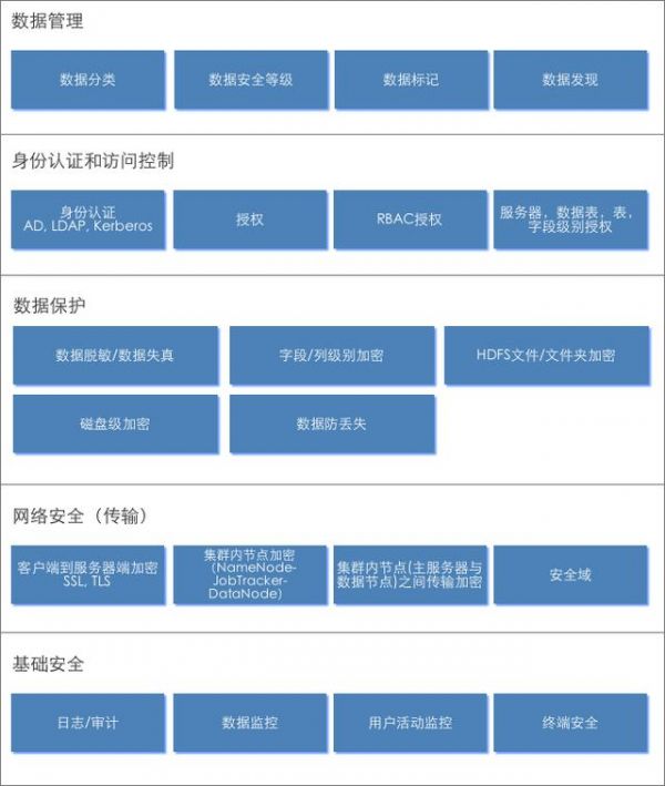 基于以上四層的安全體系,結(jié)合大數(shù)據(jù)平臺的特性,企業(yè)在實踐大數(shù)據(jù)平臺安全化時,需要有更詳細(xì)的架構(gòu)設(shè)計,四層安全體系對應(yīng)在實際環(huán)境中,應(yīng)是以數(shù)據(jù)為中心,建立完善的管理制度,先治理好大數(shù)據(jù),再從訪問控制和數(shù)據(jù)保護(hù)層面加強(qiáng)對數(shù)據(jù)使用的安全防護(hù),最后從網(wǎng)絡(luò)和基礎(chǔ)層加固平臺的安全部署。因此,大數(shù)據(jù)安全框架需包含以下5個核心模塊: 數(shù)據(jù)管理、身份和訪問管理、數(shù)據(jù)保護(hù)、網(wǎng)絡(luò)安全、基礎(chǔ)安全。