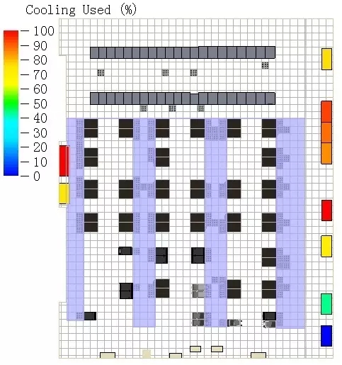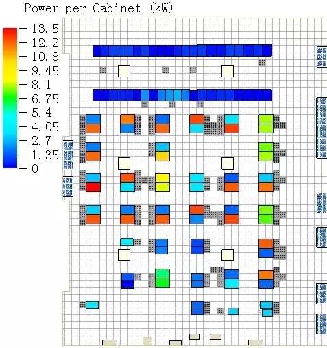 模擬結(jié)果:所有機(jī)柜最高進(jìn)風(fēng)溫度滿足要求,沒有機(jī)柜處于過熱或臨近過熱狀態(tài)。