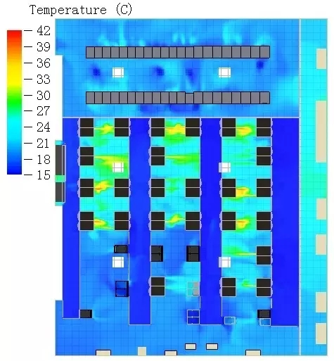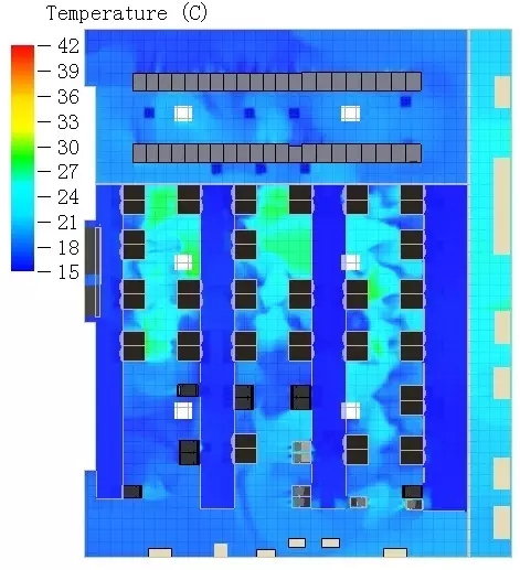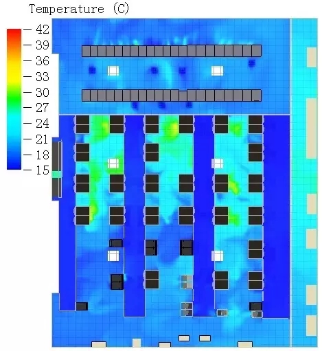 運(yùn)算完成后,輸出各種結(jié)果,包括任意平面的溫度場云圖(通常選取三個高度的水平面溫度場云圖)、空調(diào)氣流流線圖(包括送風(fēng)、回風(fēng)氣流流線圖)、各空調(diào)利用率、各機(jī)柜過熱狀況示意圖、機(jī)房熱負(fù)荷分布圖等。