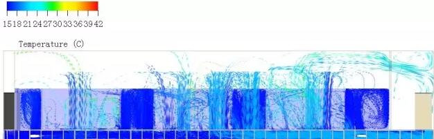 從上面的送風(fēng)氣流圖(不顯示機(jī)柜)可見,在進(jìn)行了冷通道封閉后,空調(diào)送風(fēng)大部分在冷通道內(nèi),部分通過機(jī)柜底部的孔洞進(jìn)入機(jī)柜,而不是短路回到空調(diào)、或竄氣到熱通道。這樣空調(diào)送風(fēng)的利用效率得以提高。