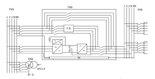 從圖1中可以看出,在UPS上下線都是TN-S接地方式時(shí),由晶閘管整流器組成的UPS或稱之為工頻機(jī)(無(wú)論這個(gè)稱呼是否準(zhǔn)確),其中性線N是由UPS的旁路輸入端引入的,并且與逆變變壓器(而不是起“隔離”作用的變壓器)的中性點(diǎn)直接連接,作為UPS輸出的中性線。這種連接方式的目的是:由于UPS的靜態(tài)旁路時(shí)時(shí)刻刻處于“待切換”的鎖相同步狀態(tài),當(dāng)負(fù)載需要從逆變器供電切換到由靜態(tài)旁路供電(或相反切換)時(shí),為了避免兩路交流電源切換時(shí)由于基準(zhǔn)電位不一致而產(chǎn)生較大的環(huán)流,導(dǎo)致切換失敗,因此這兩路電源的基準(zhǔn)電位必須是一致的,在電路上是采用同一條中性線的連接作為基準(zhǔn)電位來(lái)保證。