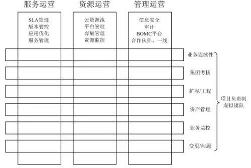 考慮到資源池初始階段還有很多傳統(tǒng)架構(gòu)和云架構(gòu)并存,且資源池需要提前建設(shè),上述劃分僅適應(yīng)運(yùn)營(yíng)階段需要,我們?cè)谶\(yùn)營(yíng)團(tuán)隊(duì)中橫向構(gòu)建了跨專業(yè)的虛擬團(tuán)隊(duì),作為項(xiàng)目小組,人員跨資源運(yùn)營(yíng)和服務(wù)運(yùn)營(yíng)的成員組成,例如擴(kuò)容項(xiàng)目組、工程項(xiàng)目組、業(yè)務(wù)連續(xù)性項(xiàng)目組等,作為臨時(shí)需要時(shí)的一個(gè)扁平化團(tuán)隊(duì),如下圖所示: