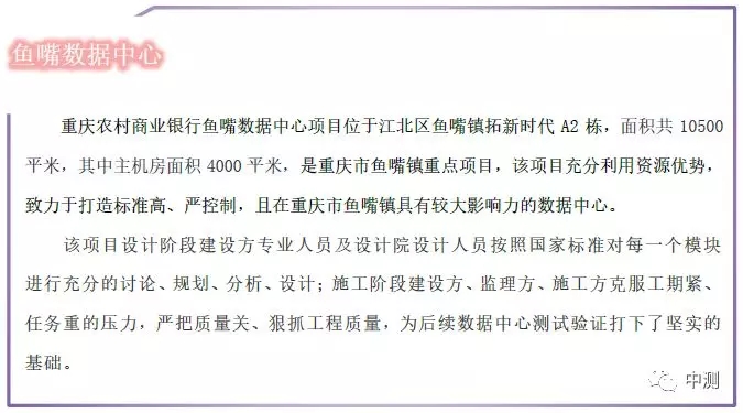 2018年9月26日,由北京中測信通科技發(fā)展有限公司提供檢測驗證服務的“重慶農(nóng)村商業(yè)銀行魚嘴數(shù)據(jù)中心”,成功榮獲CQC(中國質量認證中心)數(shù)據(jù)中心場地基礎設施評價增強級(GB50174-2008 A級)認證。