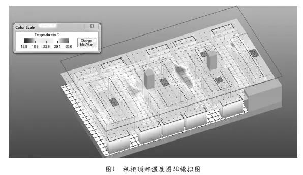 雖然熱通道平均溫度只有25℃,但是部分區(qū)域如D列熱通道會(huì)出現(xiàn)熱點(diǎn),溫度超過35℃左右。而對(duì)于低功耗3、4號(hào)冷通道,冷量超過需求,機(jī)房?jī)?nèi)冷熱資源分布不均造成浪費(fèi)。圖1給出了機(jī)柜頂部溫度圖3D模擬圖。