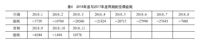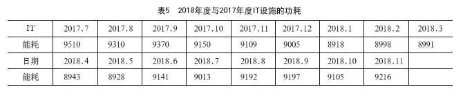 本節(jié)將對(duì)項(xiàng)目改造前后近兩年相同月份的空調(diào)能耗進(jìn)行對(duì)比分析。我們?cè)O(shè)定上海地區(qū)每年的天氣都一樣,由此,比較了2018年度與2017年度同期的空調(diào)能耗,得出表4所示的數(shù)據(jù)。我們用2018年度的空調(diào)能耗減去2017年度的空調(diào)能耗,負(fù)值則表示2018年度低于2017年度的能耗值,正值則表示高于,表中單位為kWh。與此同時(shí),我們監(jiān)測(cè)在此期間IT設(shè)施的功耗運(yùn)行平穩(wěn)(見表5)。