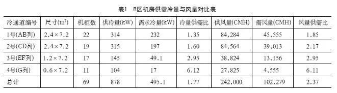 通過將地板出風(fēng)口處的風(fēng)速參數(shù)輸入到CFD軟件中,模擬出冷通道內(nèi)風(fēng)量供需比分布圖。改造前的能耗較大的2個(gè)冷通道(1號(hào)和2號(hào)冷通道),風(fēng)量供應(yīng)較低;而對(duì)于低功耗的3號(hào)和4號(hào)冷通道,風(fēng)量供應(yīng)較大。R區(qū)機(jī)房10臺(tái)空調(diào)全開的額定最大送風(fēng)風(fēng)量為242,000CMH,實(shí)際模擬和分析所需風(fēng)量?jī)H為102,279CMH,供應(yīng)風(fēng)量遠(yuǎn)大于實(shí)際所需風(fēng)量。
