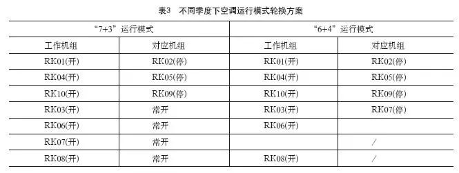 通過理論模擬與實(shí)際測(cè)量發(fā)現(xiàn):RK01與RK02,RK04與RK05,RK09與RK10可以形成互補(bǔ)工作機(jī)組,機(jī)組可以輪換工作;RK03、RK06、RK07、RK08無互補(bǔ)機(jī)組,實(shí)行24小時(shí)工作模式,制定了以周為單位進(jìn)行輪換的機(jī)制。若四臺(tái)無互補(bǔ)機(jī)組的空調(diào)遇到檢修,則將其相鄰兩臺(tái)空調(diào)機(jī)組打開。具體如表3所示。