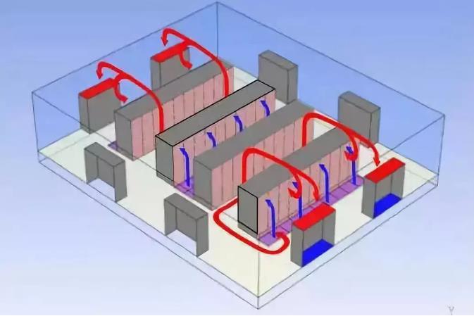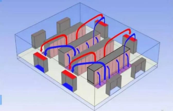 另一方面,考慮在一間矩形的房間內(nèi)放有空調(diào)設(shè)備,活動(dòng)地板以及沒有管道的房間。為了討論的方便,我們假定機(jī)架列的長度都是相同的方向。空調(diào)位于房間冷通道的位置,冷風(fēng)從空調(diào)前端送入冷通道繞過空氣流動(dòng),熱回風(fēng)從熱通道流出。這種空方式多少可以調(diào)整熱通道與冷通道的風(fēng)量,但這種方式,在一定程度上會(huì)呈現(xiàn)出不受控制的回風(fēng)系統(tǒng)。