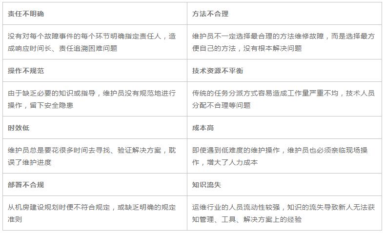 雖然大多數(shù)據(jù)中心已經(jīng)進入到了智能化運維的階段,但依然有一部分數(shù)據(jù)中心還在采用傳統(tǒng)的運維模式,每天通過人工去頻繁地監(jiān)測、維護、部署。這種模式過度依賴運維人員的技能、經(jīng)驗和責任心,很容易導(dǎo)致故障的重復(fù)發(fā)生,甚至引發(fā)其他更嚴重的問題。