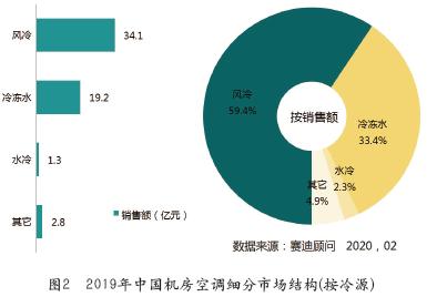 按照制冷冷源不同,機房空調(diào)可以分為風冷型、水冷型和冷凍水型。隨著數(shù)據(jù)中心綠色節(jié)能、高密度、超大規(guī)模的發(fā)展趨勢,特別是大型互聯(lián)網(wǎng)企業(yè)的新建數(shù)據(jù)中心,傳統(tǒng)風冷型制冷技術已經(jīng)無法滿足所需的散熱能力,冷凍水型制冷系統(tǒng)在高效制冷和大制冷量方面的優(yōu)勢,推動了其較快推廣。據(jù)賽迪顧問統(tǒng)計,從市場需求和銷售額來看,風冷型制冷仍是目前機房空調(diào)中的主流機型,但冷凍水型制冷呈現(xiàn)較快增長趨勢。2019年,風冷型機房空調(diào)市場銷售額達34.1億元,市場占有率為59.4%;冷凍水型機房空調(diào)市場銷售額達19.2億元,市場占有率為33.4%,見圖2。