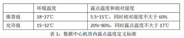 露點(diǎn)溫度是數(shù)據(jù)中心內(nèi)部用于監(jiān)控機(jī)房環(huán)境的重要參數(shù)。在數(shù)據(jù)中心里,肯定不能讓房間的溫度達(dá)到露點(diǎn)溫度,F(xiàn)在的數(shù)據(jù)中心建設(shè)規(guī)模都比較大,機(jī)房內(nèi)設(shè)備密度也大。數(shù)據(jù)中心內(nèi)部的溫差巨大,但露點(diǎn)溫度在整個(gè)房間的范圍內(nèi)基本上是一致的,所以這是一個(gè)更靠譜的濕度調(diào)節(jié)指標(biāo)。因?yàn)榇罅康臒嵩蠢鋮s設(shè)備沒有提供濕度控制,又必須讓控制的濕度保持在露點(diǎn)以上來避免結(jié)露,露點(diǎn)控制是唯一手段。根據(jù)電子信息設(shè)備技術(shù)的發(fā)展、國外相關(guān)標(biāo)準(zhǔn)的變化以及節(jié)能要求,對數(shù)據(jù)中心內(nèi)部的露點(diǎn)溫度等參數(shù)做了詳細(xì)規(guī)定。機(jī)房內(nèi)的溫度、露點(diǎn)溫度和相對濕度應(yīng)滿足電子信息設(shè)備的使用要求,具體如表1所示: