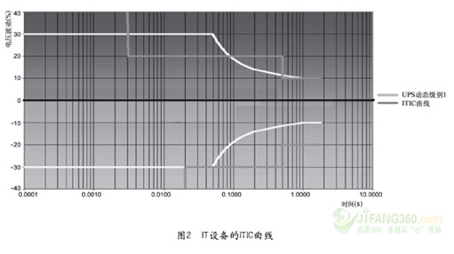 由此可以得出如下結(jié)論:IT負(fù)載完全允許在一定范圍內(nèi)波動的輸入交流電源。這一結(jié)論也與 IEEE給出的計算機對電能質(zhì)量要求的ITIC電壓容限曲線完全相符,如圖2所示。
