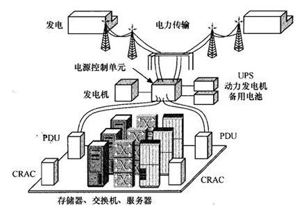 為了在停電期間和發(fā)電機啟動并提供穩(wěn)定電力之前的短時間內可以繼續(xù)用電,通常使用不間斷電源(UPS)系統(tǒng)。電源管理開關可以手動或自動地在電力公司供電和自發(fā)電之間切換,以便進行維修、診斷和故障排除,或者用于帶有負載平衡的維修旁路。配電器(PDU)可以把來自電源管理系統(tǒng)的高壓電轉變?yōu)镮T設備所需的電力。電纜可以鋪設在架空地板的下方或高架管道中。通常PDU可以遍布數(shù)據中心的不同位置,為服務器、存儲器、網絡設備以及計算機機房空調(CRAC)和HVAC提供電力。