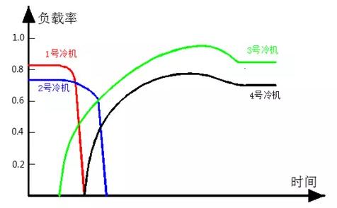 從冷機負(fù)載率隨時間變化曲線圖上可以清晰的看到,3號冷機啟動后其負(fù)載率迅速上升,1號和2號冷機負(fù)載率迅速下降;運行一段時間后,關(guān)閉1號冷機,開啟4號冷機,同樣4號冷機啟動后其負(fù)載率迅速上升;此過程: