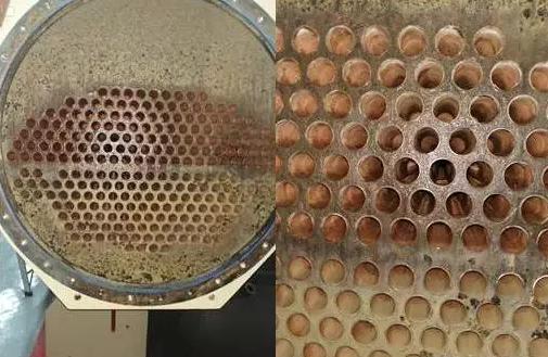 冷凝器內(nèi)制冷劑溫度一般在65℃以上,雖然冷卻水在進出冷凝器時整體的最高溫度不超過35℃,但在冷凝器換熱單元中靠近65℃以上制冷劑的局部冷卻水由于溫度較高,會產(chǎn)生水垢等增加換熱熱阻,影響冷機的負(fù)載率 |