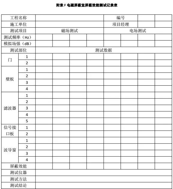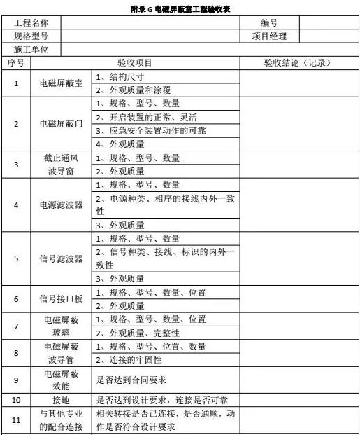 6、施工交接驗(yàn)收應(yīng)符合《數(shù)據(jù)中心基礎(chǔ)設(shè)施施工及驗(yàn)收規(guī)范》GB50462-2015第3.3.2條的規(guī)定,并應(yīng)提交《電磁屏蔽室屏蔽效能測(cè)試記錄表》和《電磁屏蔽室工程驗(yàn)收表》。