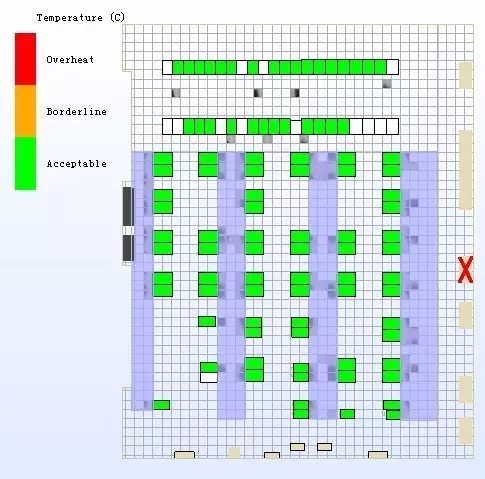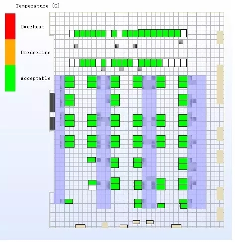 模擬結(jié)果:所有機(jī)柜最高進(jìn)風(fēng)溫度滿足要求,沒有機(jī)柜處于過熱或臨近過熱狀態(tài)。