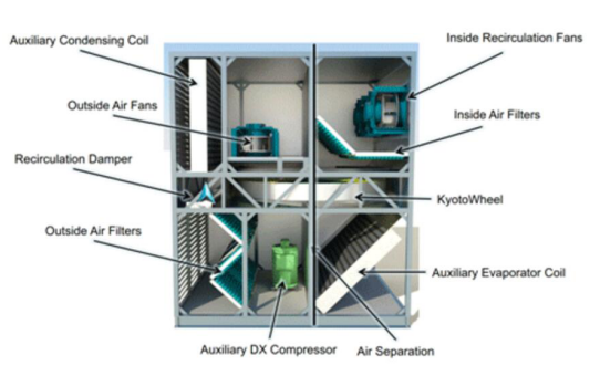 利用Kyoto wheel(滾動(dòng)式熱交換器)作為過濾器更好的改善這個(gè)問題。它由一個(gè)通過兩部分空間旋轉(zhuǎn)的金屬輪組成。 當(dāng)冷空氣通過第二部分進(jìn)入時(shí),中心的熱空氣流過一個(gè)空間。 當(dāng)熱空氣流過一個(gè)空間時(shí),熱量傳遞到車輪的金屬中,然后空氣流回?cái)?shù)據(jù)中心,而外部空氣則從金屬吸收熱量。