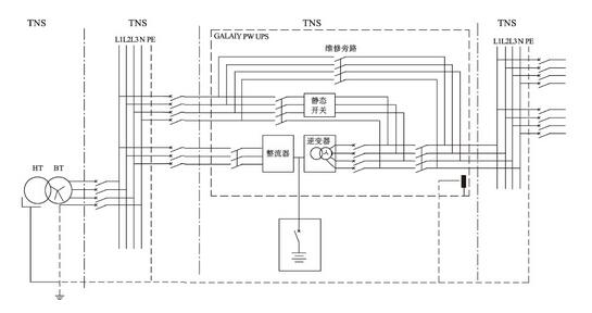 從圖1中可以看出,在UPS上下線都是TN-S接地方式時(shí),由晶閘管整流器組成的UPS或稱之為工頻機(jī)(無(wú)論這個(gè)稱呼是否準(zhǔn)確),其中性線N是由UPS的旁路輸入端引入的,并且與逆變變壓器(而不是起“隔離”作用的變壓器)的中性點(diǎn)直接連接,作為UPS輸出的中性線。這種連接方式的目的是:由于UPS的靜態(tài)旁路時(shí)時(shí)刻刻處于“待切換”的鎖相同步狀態(tài),當(dāng)負(fù)載需要從逆變器供電切換到由靜態(tài)旁路供電(或相反切換)時(shí),為了避免兩路交流電源切換時(shí)由于基準(zhǔn)電位不一致而產(chǎn)生較大的環(huán)流,導(dǎo)致切換失敗,因此這兩路電源的基準(zhǔn)電位必須是一致的,在電路上是采用同一條中性線的連接作為基準(zhǔn)電位來(lái)保證。