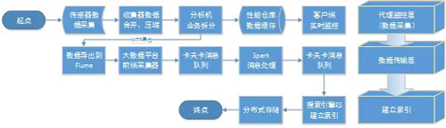 利用大數(shù)據(jù)集中處理平臺(tái)的處理流程主要分兩部分,通過消息隊(duì)列處理Flume采集的日志,再通過ElasticSearch建立索引,最終將數(shù)據(jù)、索引導(dǎo)入在mysql集群。如下: