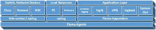 無論是網(wǎng)絡(luò)設(shè)備、應(yīng)用服務(wù)器還是中間件,其日志需要與Flume節(jié)點(diǎn)對(duì)接,這就涉及到協(xié)議適配的問題,為此專門針對(duì)企業(yè)總線(eBus、UAP)、前端Web容器及交易中間件配置協(xié)議適配驅(qū)動(dòng),將日志以流的方式傳輸給Flume代理,協(xié)議適配層提供了較豐富的協(xié)議適配驅(qū)動(dòng),能夠支持來自各層面基礎(chǔ)設(shè)施的日志數(shù)據(jù)對(duì)接,目前已成功接入的基本組件有交換機(jī)、負(fù)載均衡器、各刀片服務(wù)器操作系統(tǒng)及應(yīng)用程序,如圖所示:
